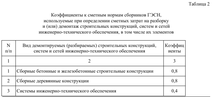 п.83 При отсутствии в сборниках ГЭСН и ГЭСНр сметных норм на работы по демонтажу (разборке) строительных конструкций, систем и сетей инженерно-технического обеспечения, в том числе их элементов, при определении сметных затрат применяются сметные нормы на устройство, установку строительных конструкций, систем и сетей инженерно-технического обеспечения, в том числе их элементов, включенные в сборники ГЭСН, с применением коэффициентов, приведенных в таблице 2: