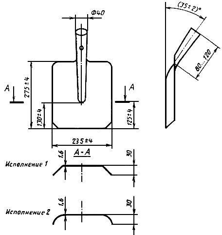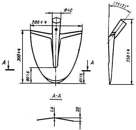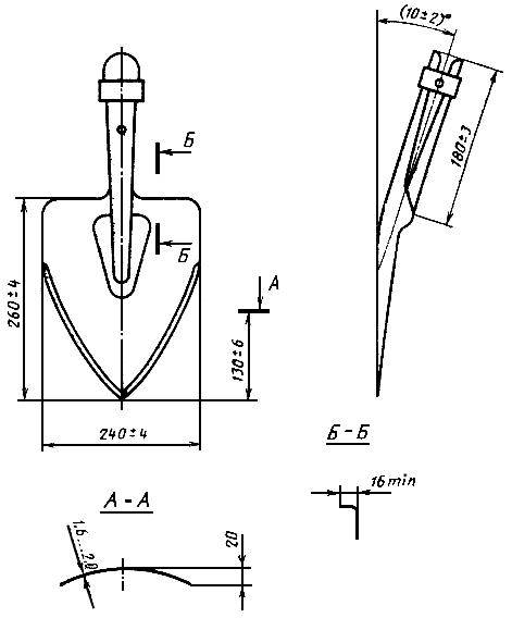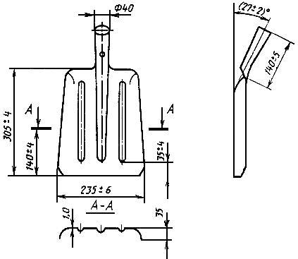 4.2. Проверку размеров лопат, предельных отклонений размеров, угла заострения и толщины режущей кромки (пп.2.1; 2.5; 2.6; 2.9-2.11) следует проводить универсальным измерительным инструментом или шаблонами.