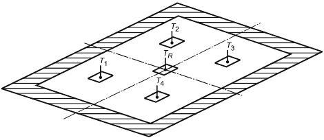 Для определения толщины листов изоляционного материала источник тепла с равномерным распределением тепла размером 1х1 м и мощностью (100±2) Вт помещают по центру между слоями изоляционного материала. Оксидированную медную пластину размером 65х65х0,5 мм, к которой крепят термопару с тонкой нитью, помещают в центре верхней поверхности источника тепла.