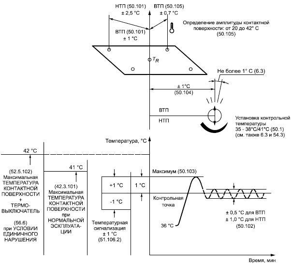 Клинические обследования предполагают, что ректальные температуры между 36 °С и 38 °С и есть наиболее приемлемые колебания между гипотермией и гипертермией. Поэтому, если 37 °С считают нормальной ректальной температурой и если она отличается от этого значения на ±1 °С, необходима сигнализация. Так как основная температура должна соответствовать ТЕМПЕРАТУРЕ КОНТАКТНОЙ ПОВЕРХНОСТИ НАГРЕВАТЕЛЬНОГО УСТРОЙСТВА с НИЗКОЙ ТЕПЛОПЕРЕДАЧЕЙ, такая сигнализация должна сработать, когда ТЕМПЕРАТУРА КОНТАКТНОЙ ПОВЕРХНОСТИ отличается от установленной температуры более чем на ±1 °С.