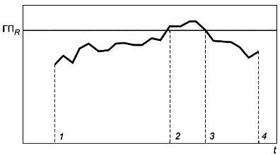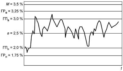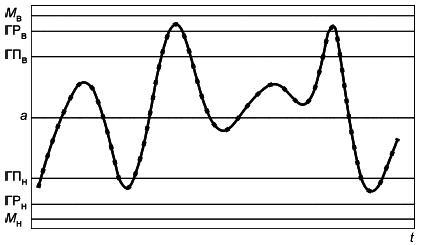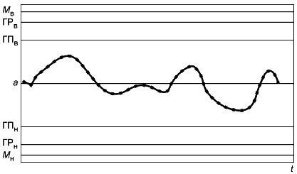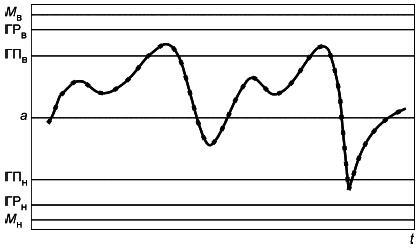 (VI) в некоторых случаях выходит за пределы предупреждающих границ, но остается внутри границ регулирования. Размах остается меньше предупреждающей границы контрольной карты. Контрольная карта размахов в данном примере не приведена. Цемент принимают и разрешают к поставке, т.к. условия Г.2 выполнены, но принимают меры для регулирования технологического процесса (увеличивают или уменьшают подачу гипсового камня) в целях возвращения скользящего среднего в предупреждающие границы контрольной карты, а также приближения скользящего среднего к нормативу технологического регламента.