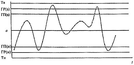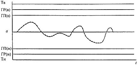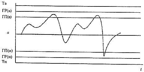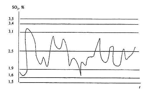в некоторых случаях выходит за пределы предупреждающих границ, но остается внутри границ регулирования. Цемент принимают и разрешают к поставке, но необходимо принять меры для регулирования технологического процесса (подачу гипсового камня) с целью возвращения текущего среднего по содержанию