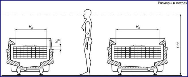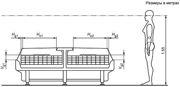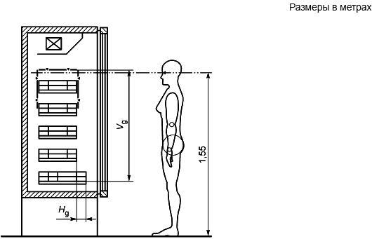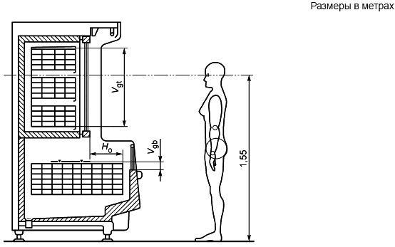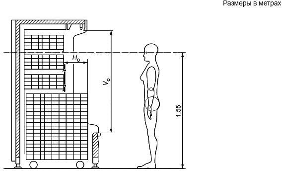 . Для многоярусных витрин и шкафов-горок площадь горизонтальной проекции измеряют в плоскости, отстоящей от пола на расстоянии 1,55 м, принимая во внимание доступные обозрению продукты питания, расположенные в передней части ярусов (полок) (см. рисунок А.3).