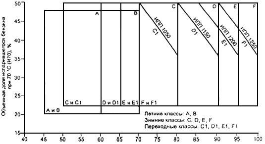 Стандарт предусматривает производство 10 классов бензинов по испаряемости. Предельные значения характеристик испаряемости приведены в таблице 2. Диаграмма определения классов испаряемости бензинов приведена на рисунке 1.