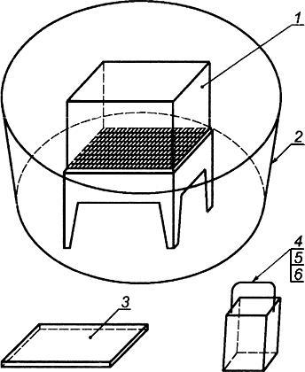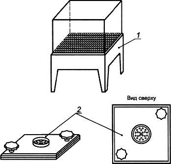 1 — металлическая рама с сетчатым дном на ножках; 2 — сосуд; 3 — плита из органического стекла;
