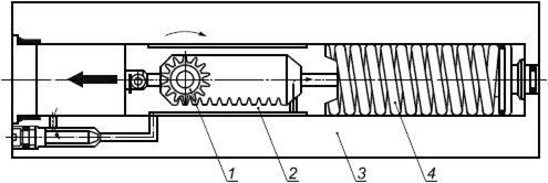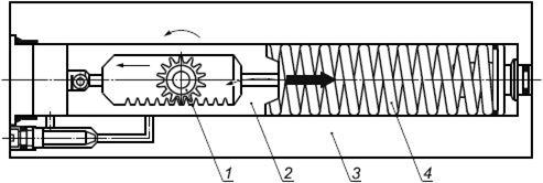 1 — шестерня, совмещенная со шпинделем доводчика; 2 — поршень с зубчатой рейкой; 3 — корпус доводчика (гидроцилиндр); 4 — возвратная пружина