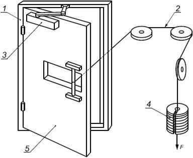 1 — дверная поворотная опора; 2 — трос к падающим грузам; 3 — испытательная дверь с доводчиком, открытая на 90°