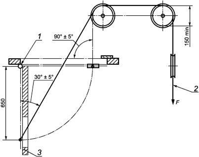 Д.1.4 Устройство для испытания доводчиков на закрывание двери с перегрузкой должно включать в себя систему, состоящую из троса, блоков и груза, как показано на рисунках Д.1 и Д.4. Масса груза при испытании двери с учетом перегрузки приведена в таблице 3.