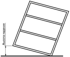 7.9.2 Картотека должна быть установлена согласно 7.6.5. После этого одну боковую стенку картотеки устанавливают на ребро и поднимают на высоту падения, значение которой указано в таблице 3, в соответствии с весом ненагруженной картотеки, затем отпускают и картотека падает на испытательную платформу (см. рисунок 4).